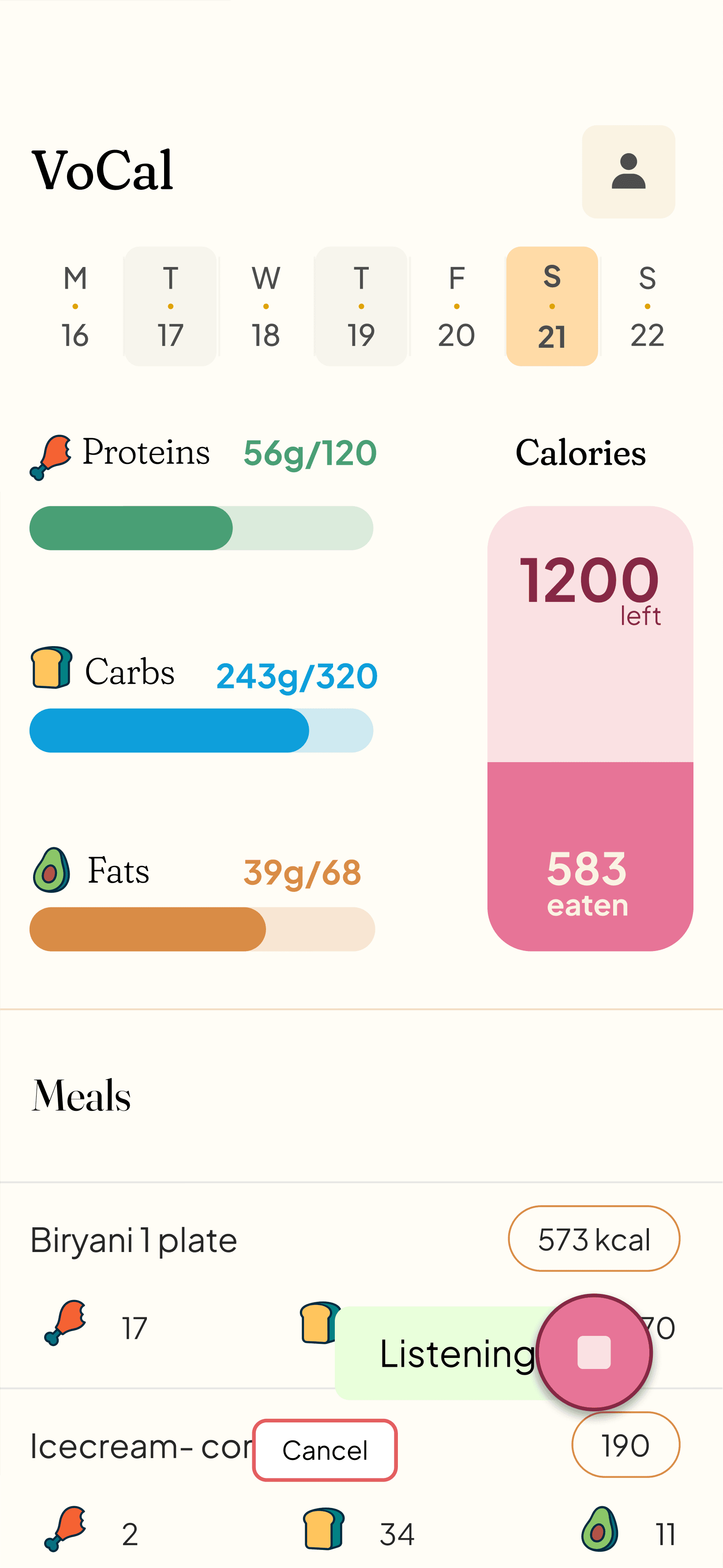 VoCal is a voice-based calorie tracking app designed for Indian food and real-life eating habits.You log meals by speaking instead of typing, scanning, or taking photos. VoCal then converts meals into calories, macros, and long-term nutrition insights.How is VoCal different from other calorie tracking apps?