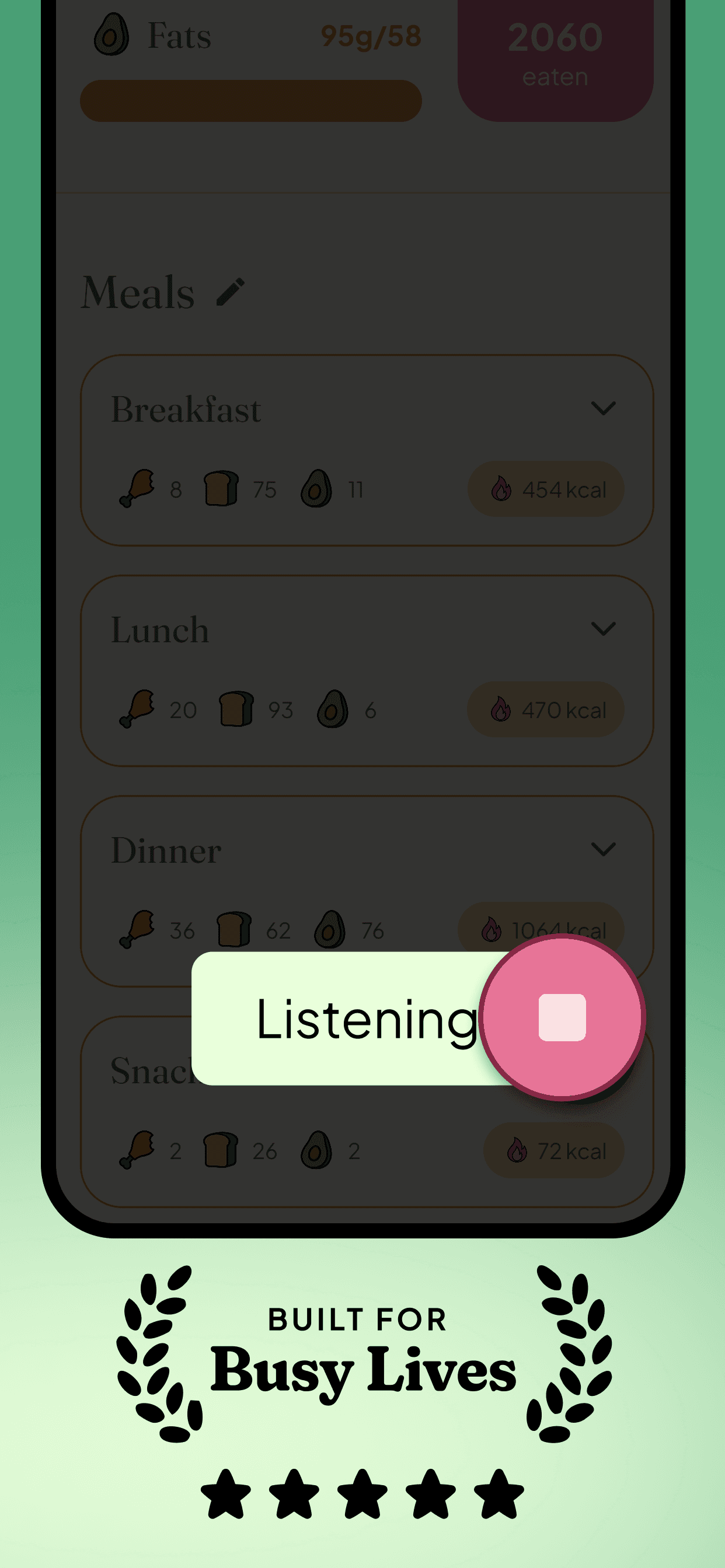 Log meals naturally by speaking. No typing, no searching, no manual entry.