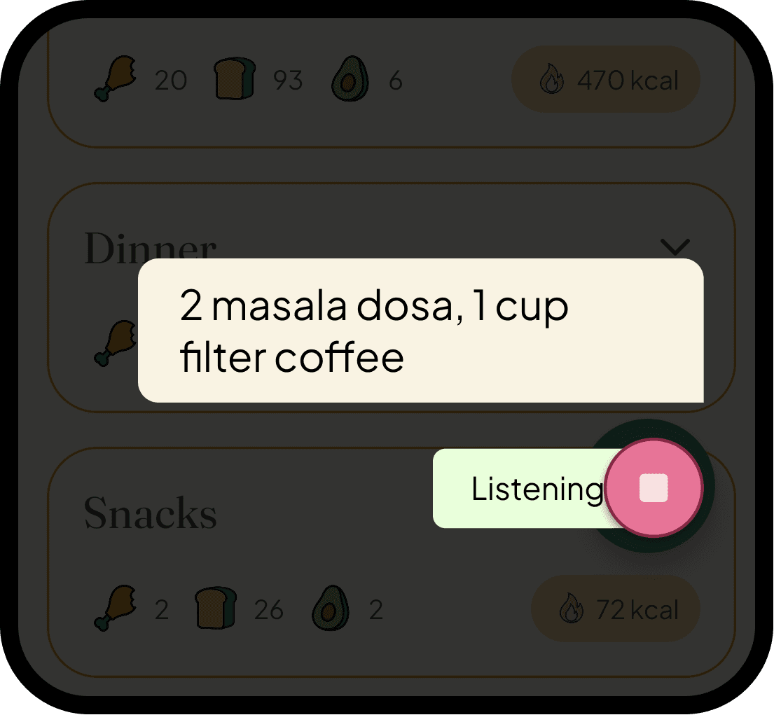 It allows you to log meals by speaking in your preferred Indian language, instead of typing, searching databases, or taking food photos.